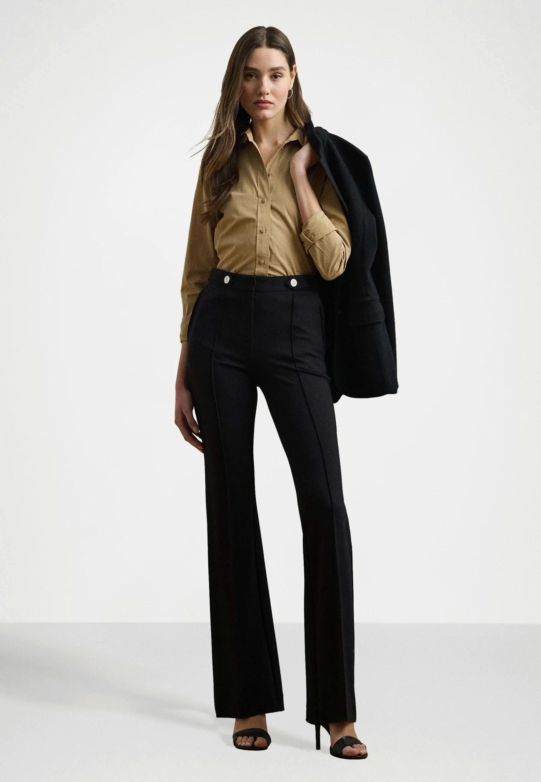 Tay áo dài cài nút cổ tay; nút ngọc trai khắc “Lauren Ralph Lauren”