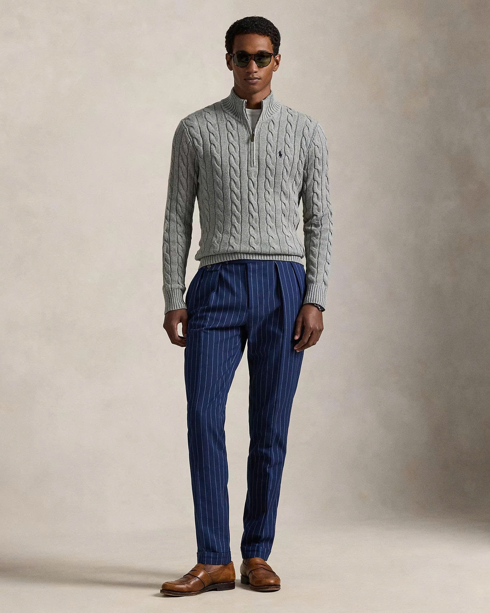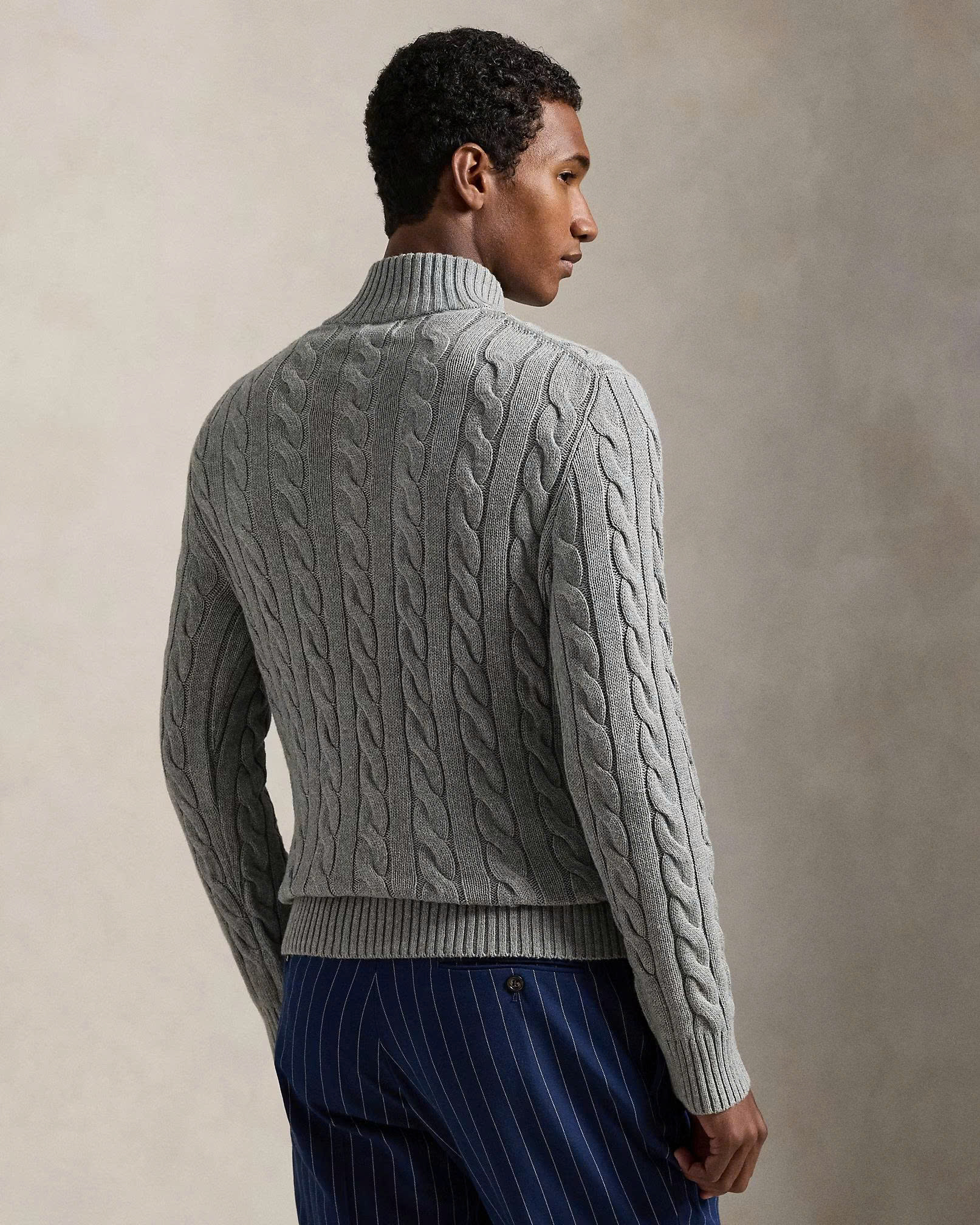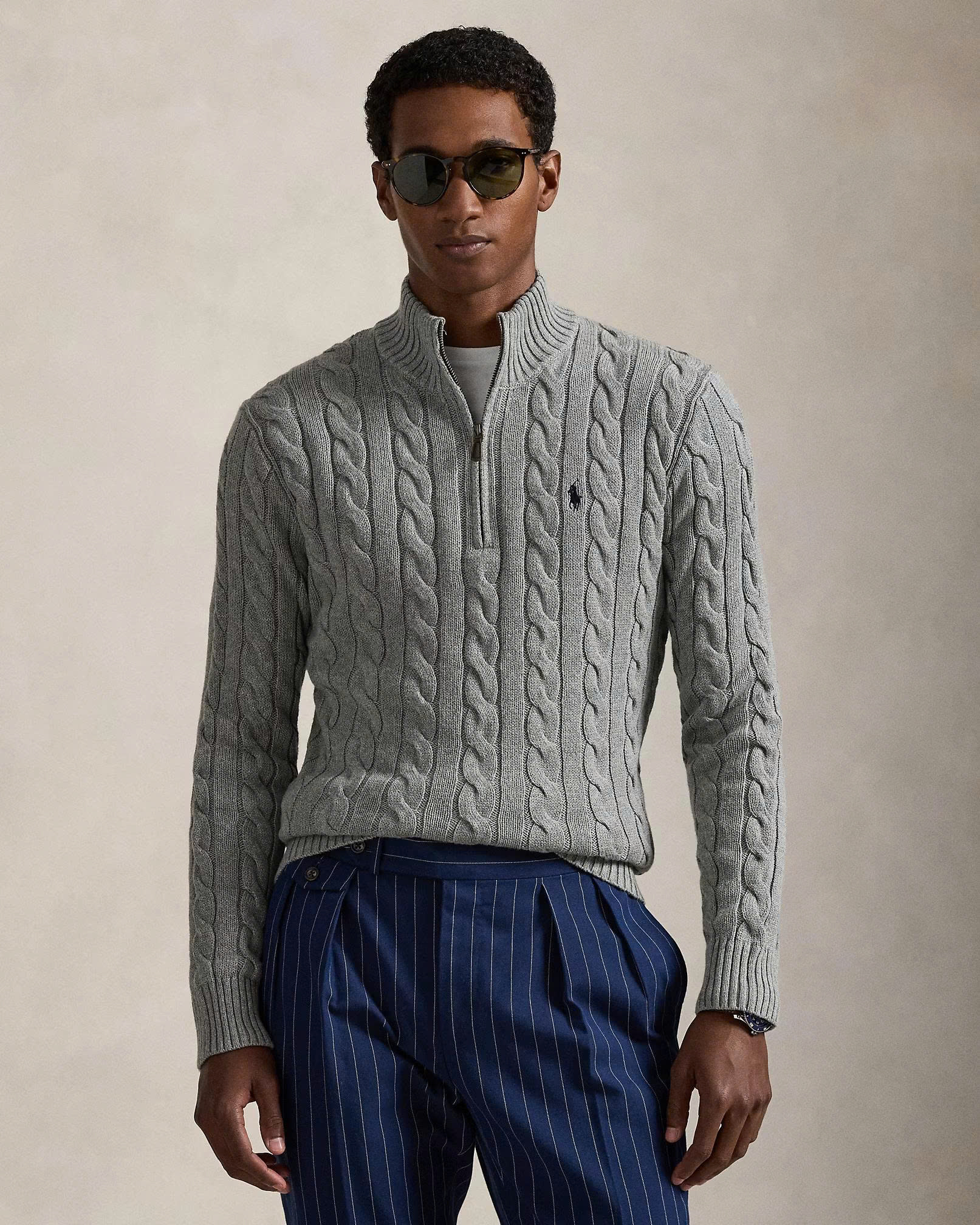 • Chiếc áo len khóa kéo một phần tư của Ralph Lauren kết hợp hai chi tiết thiết kế biểu tượng nhất của Polo Ralph Lauren: họa tiết đan dây cáp và Logo Pony đặc trưng